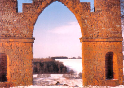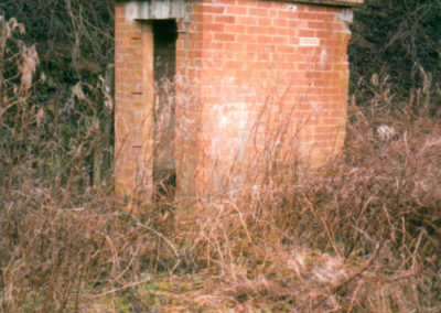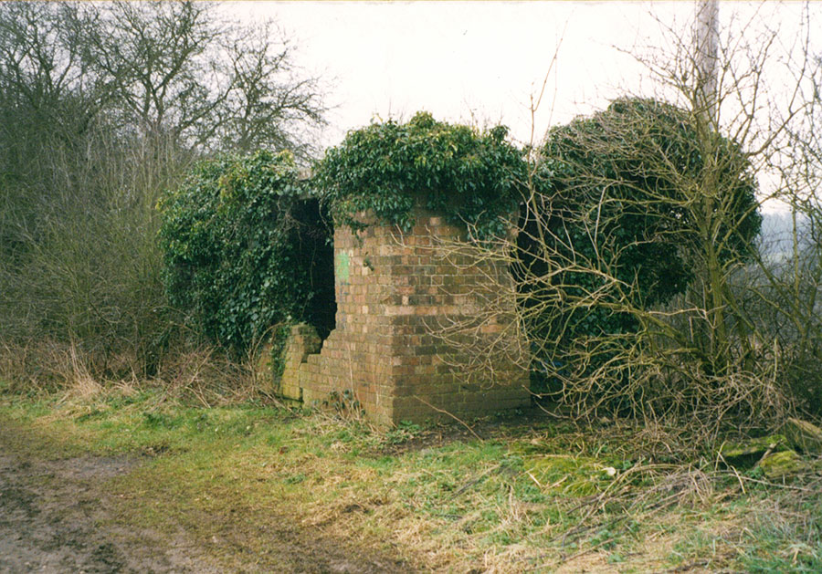 Oxfordshire Ironstone Railway’s permanent way hut (known as a P-hut) at Drayton in 2005. A P-hut was used by track maintenance staff. At the far right is a pile of rubble where a signal post used to be.